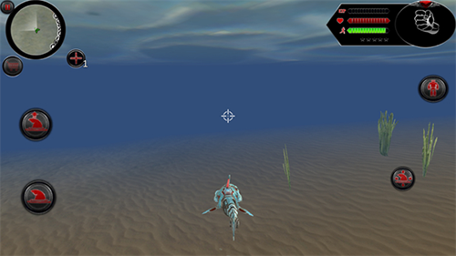 5、当跳入水中后,点击右侧的切换按钮,就能使机器人变换为鲨鱼形态。
