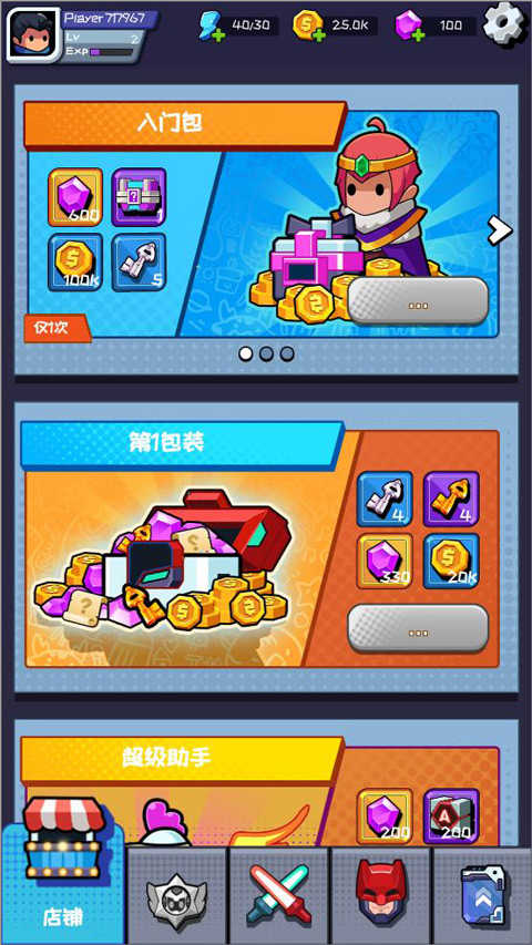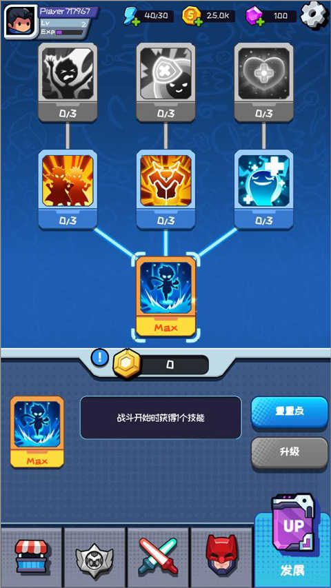 2、完成初始章节通关后,商店、英雄管理以及升级等核心功能会随之解锁。此时,玩家能够使用收集到的钻石,去购置升级所需要的道具与装备,从而进一步提升自身的战斗力。