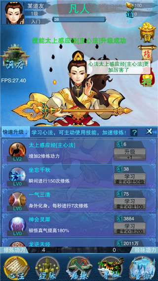 5、对于在线时间较长的道友,建议在前期(120级之前)主要提升心法等级。