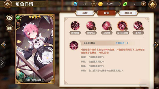 拉姆「窗外的风景」这一SP技能,效果是提升全体角色的攻击伤害,并且能让下一次非必杀技攻击必定触发暴击。至于爱蜜莉雅的SP技能,机制是每暴击一个敌人,就能减少自身一回合的冷却时间;实战中她通常能暴击3个敌人,这样算下来,她的SP技能几乎相当于没有冷却,可以持续使用。