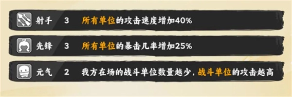 元气:我方存活战斗单位数量越少,在场战斗单位的攻击力越高。