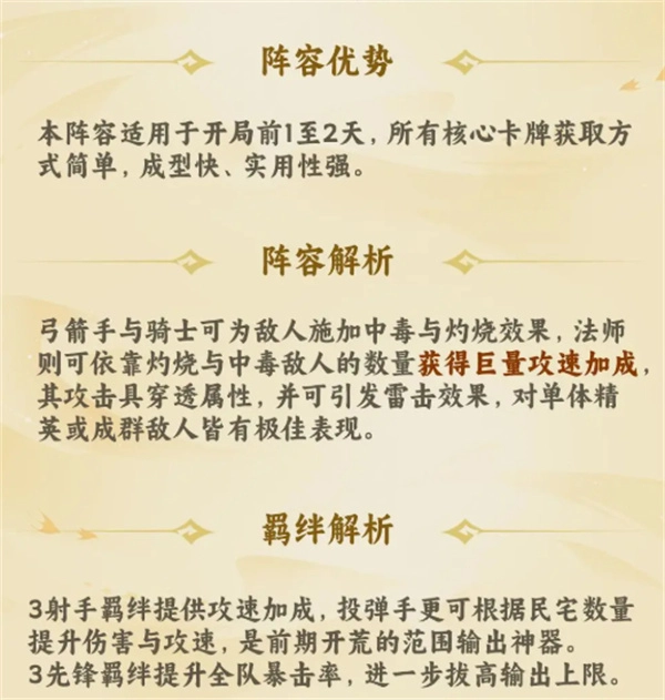 阵容优势:这套阵容适合开局初期的1到2天使用,核心卡牌都很容易获取,能快速成型且实用性突出。