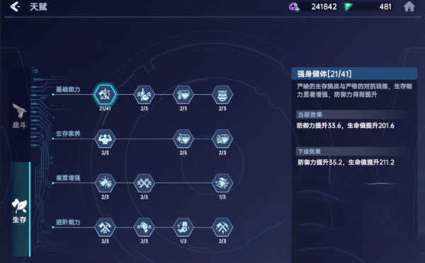 基础能力方面,建议优先把点数加在第一个“强身健体”和第二个“高效吸收”这两个选项上。
