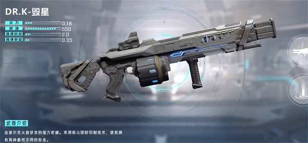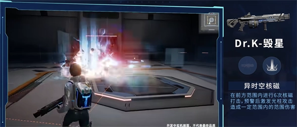 在前方区域实施6次核磁打击,预警后释放光柱攻击,对一定范围内造成范围伤害;由于Dr.K-毁星的动力源自枪托内的动力感应装置,该装置可转化无壳弹药发射时产生的能量,所以Dr.K-毁星配备了大型弹夹。