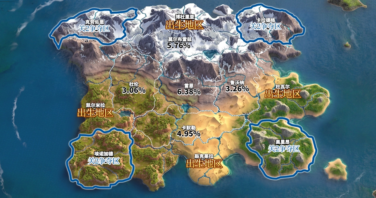 S2赛季里,出生地区从原来的三个扩充至四个,所以连接各出生地区的过渡地区也相应地从三个调整为四个,资源地区同样变为四个;最终争夺的核心地区没有变化,依旧是一个;此外,S2赛季中的关1、关2、关3均设定为永久半开放关卡,只有占领了该关卡归属区域内任意魔兽巢穴的联盟,才具备进攻该关卡的资格,简单来说,出生地区是不会被敌对领主所攻占的。