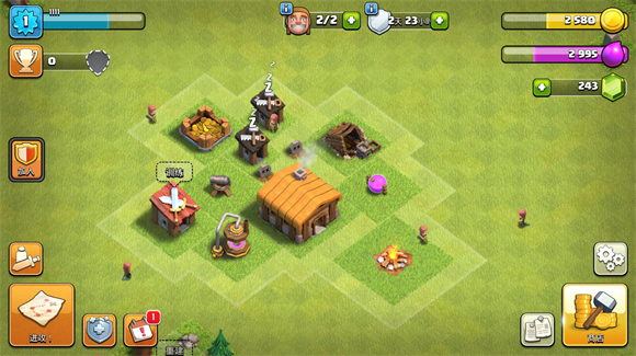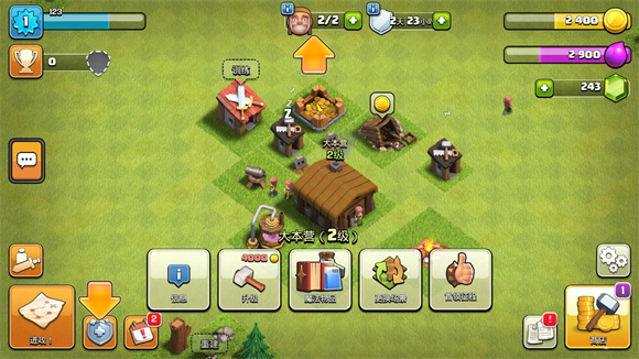 2、除了储金罐、圣水罐这类必须升级的建筑(七本的暗黑重油罐暂且不提),游戏右上角会显示当前村庄的金币和圣水数量。如果资源不够升级建筑,系统会提示用宝石补足,但初期不建议随意使用宝石,后续会说明如何让宝石发挥最大价值。把该升的建筑都升级完后,就可以直接升级大本营,而且下线前务必把村庄资源全部用完——因为初期我们基本不造防御就直接升本,村庄处于无防御状态,没资源的话就不会有太多人来攻打。不过一旦升到6本,就必须补防御、升科技,否则部落战会被打得很惨。