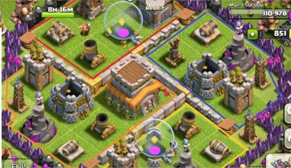 5、千万别把所有资源储存类建筑都集中摆放,毕竟所有鸡蛋放一个篮子里,结果往往是被敌人轻易夺走全部资源。通过合理规划建筑与城墙的布局,能够引导敌人的兵力走向——要么让他们扎堆,被我方迫击炮和法师塔大量杀伤;要么把他们引到陷阱区域,使其伤亡惨重。