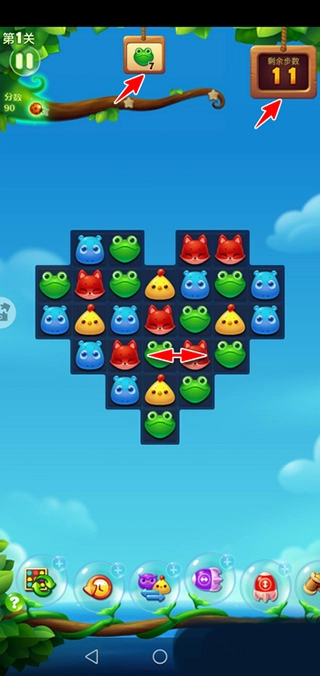 当关卡正式开启后,页面顶部中央会出现一个任务提示牌,告知你当前需要完成的目标(例如消除10只青蛙);而右上角则会显示本关可使用的步数上限(比如12步)。