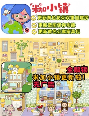 米加小镇此次更新带来了黄色花朵主题的双重自建房、蓝图保存功能以及黄色公寓家具包。