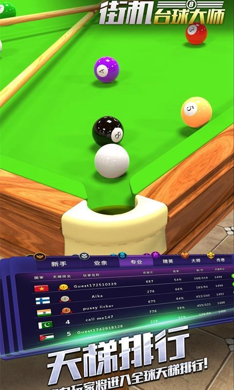 在虚拟的三维台球空间里,你可以和来自世界各地的线上对手一较高下,从默默无闻的新手逐步蜕变为备受瞩目的台球高手。