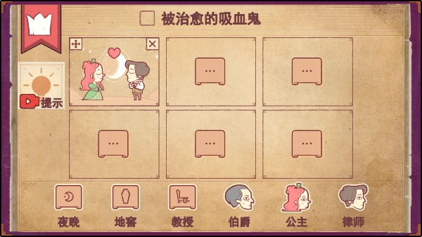 第五步把夜晚拖进第五个框里,接着将律师拽进去,再把公主也拉进去,这样吸血鬼公主就被治愈好啦!