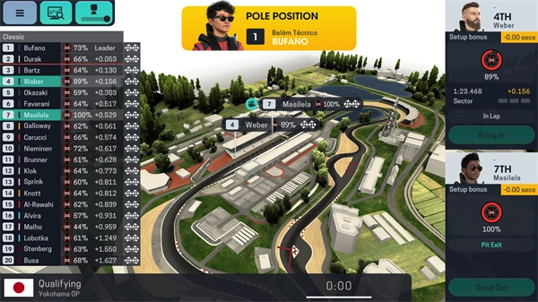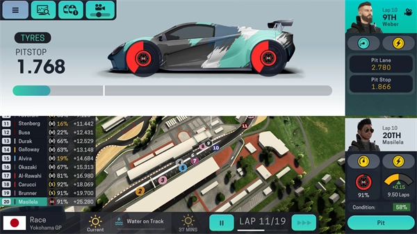 4、车手信息:屏幕左右下角会显示你所在车队两名车手的相关信息,涵盖维修站、策略、状态调控等方面,具体信息内容包括名次、区段、距离比较、油量、轮胎磨损情况,以及驾驶模式对油耗和轮胎磨损状况的影响。