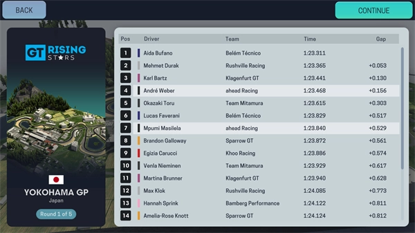 2、赛事界面名次:屏幕左侧会呈现当前赛事的排名情况,同时也会显示车手姓名、所属车队(通过颜色加以区分)以及轮胎的类型和磨损程度。
