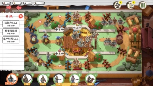 战斗单位可通过点击游戏下方的对应图标进行购买。下方黄色方框内的数字表示该单位的价格,右上角小圈顶部的数字代表当前闲置的单位数量,其下方的数字则是当前战场上已部署的该士兵数量。点击士兵图标后,会显示可预派遣的数量,同时地图上会出现三个箭头,点击箭头即可向对应的路线派遣士兵。当军队人口达到上限时,将无法继续派遣士兵。
