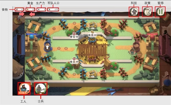 负责采集资源的单位,可通过点击地图里对应的加减号按钮来完成派遣与召回操作。上下两路的资源类型是食物,不仅路程短,采集所需的时间也比较短;而中路的资源是黄金,路程相对较长,采集花费的时间同样也更长。