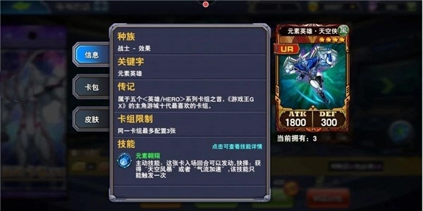技能:这张卡入场回合可以发动选择一个技能发动‘’天空风暴‘’(入场回合可以发动,随机破坏对方,自己场上除自身以外元素英雄数量的魔法陷阱卡)、‘’气流加速(入场回合可以发动选择卡组一张元素英雄加入手牌)