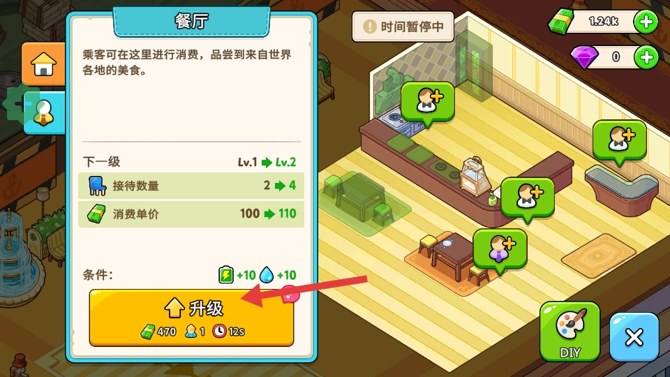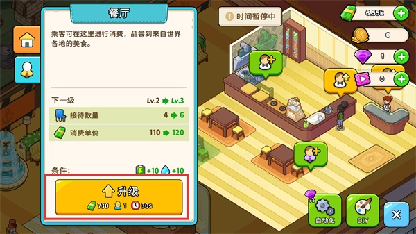 4、点击【升级】餐厅,提升接待数量和消费单价,增强餐厅经营能力。
