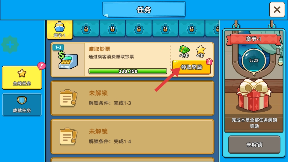 3、在任务界面点击【领取奖励】,获取钞票和星星,提升游戏进度。