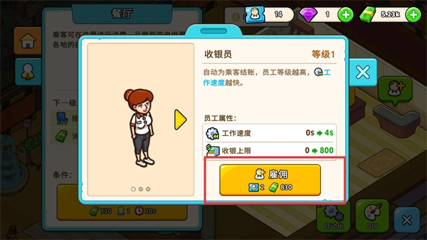 2、遇到收银员雇佣界面时,点击雇佣按钮解锁员工增强收银能力。