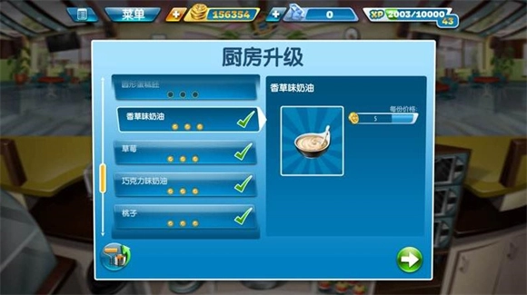 7、内饰升级能带来额外顾客、延长等待时间、提升小费金额与小费时间。每升一级,每局游戏就会多一位顾客,顾客等待上菜的时长也会增加,同时每个人给出的小费最大值会提高。简单来说,餐厅等级越高,游戏玩起来就越轻松,毕竟你不用再操心肉还没煮熟顾客就跑掉这类情况了。