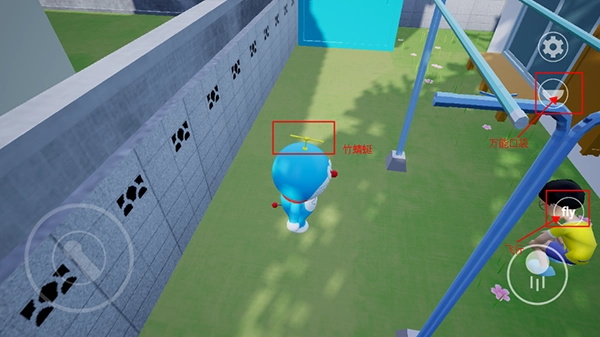 4、按照图示点击哆啦A梦的万能口袋,我给角色装备上竹蜻蜓后,右下角会出现一个写着“fly”的按钮,点击它就能让角色起飞了。