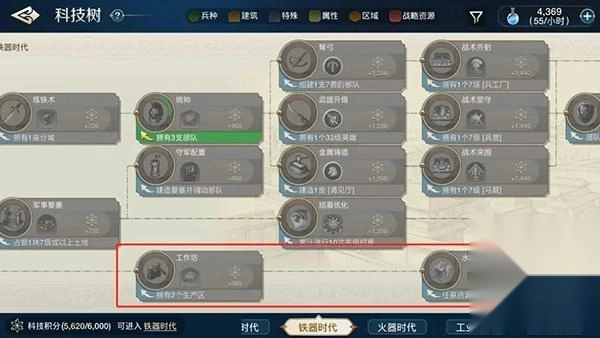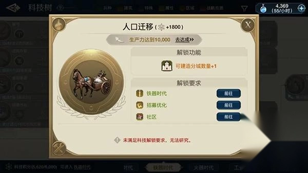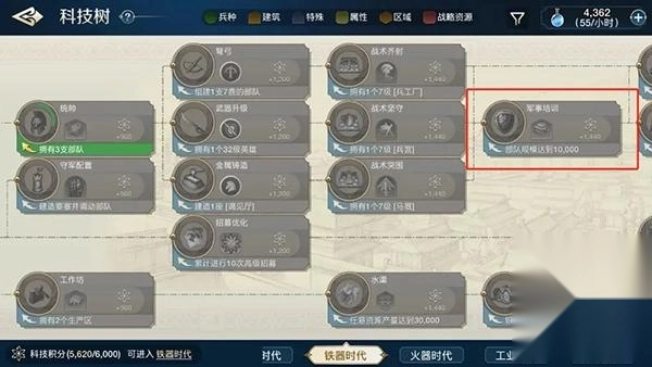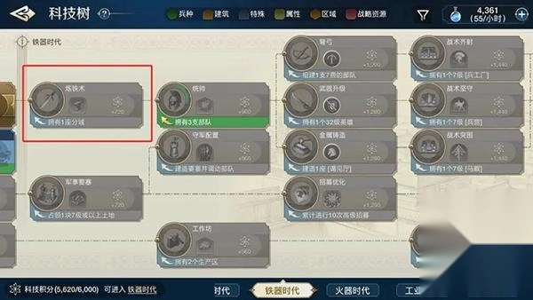 优先解锁炼铁术相关的科技,加快开启军事培训的进程。提升军队的实力,随后持续率领军队扩张领土以获取资源。