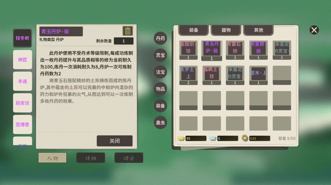 人物能够查看当前NPC的背包,还能详细了解NPC的部分信息;最近行动方面,NPC拥有自己的行动池,每月会从中触发行动;互动功能支持与NPC进行交互;功法系统则可以查看NPC的心法和功法配置(需达到足够好感度)。