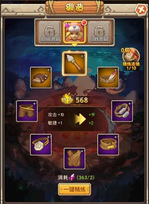 其次是精炼功能,同样支持一键操作,能快速提升装备的整体属性。