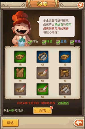 玩家获得的多余低级装备可通过熔炼系统回收,产出精炼石与石币等资源。