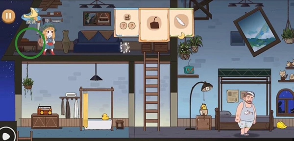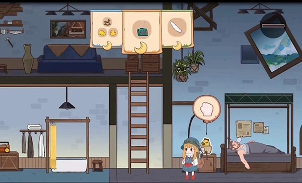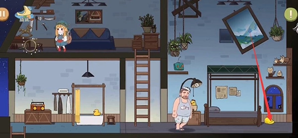 拿到帽子后我们返回,床头这边有个闹钟,设置好后去爬梯子。等闹钟响起,它会被惊醒,床上方的杆子就会被打下来,之后它继续入睡。下来拿到杆子,再去台灯那里拿一样道具。左边浴缸这边还有只小鸭子可以收集。最后回到最初的地方,就能通关了。