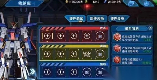 1、在格纳库菜单中,我们很容易就能找到部件的菜单页面。部件总计有攻击、防御、辅助三种不同类型的部件,根据机体等级的提升,部件背包的安装槽也有相应的扩容。