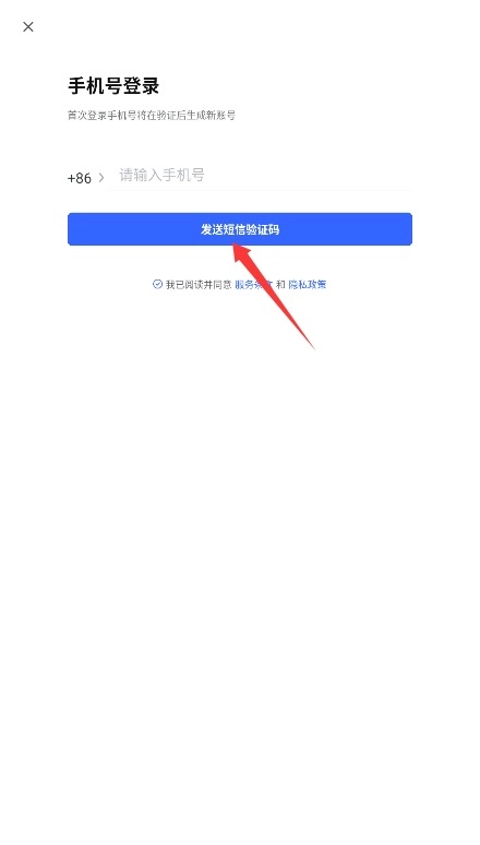 2、输入手机号码,勾选同意协议后点击发送验证码后并输入后完成登录验证。