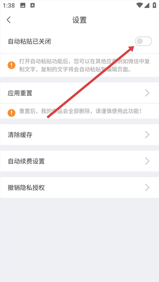 3、进入设置页面后,找到“自动粘贴已关闭”所对应的开关选项。