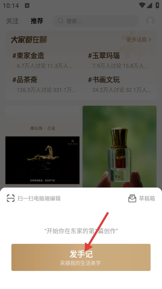 3、在弹出的窗口内,点击【发手记】进入下一步。