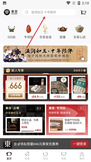 1、在东家首页,点击顶部搜索栏,进入搜索页面。