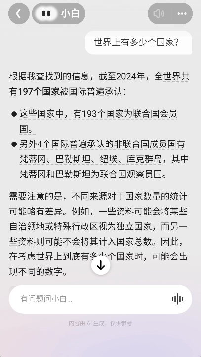 4、获取答案:问小白会根据用户的输入的问题提供答案,进行搜索信息、文本创作、逻辑推算等操作。