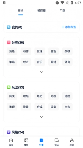 这款工具不仅包含安卓、模拟器、厂商等基础分类,还进一步细化出玩法、风格等多个维度的分类,是寻找游戏时非常实用的帮手。