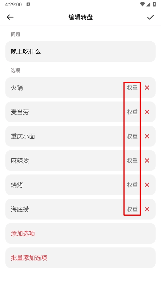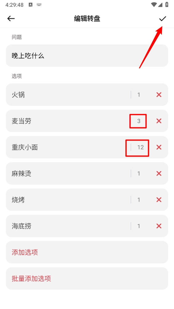 如图所示,您可以依据自身需求来设置对应的转盘概率,设置完成后点击右上角的“对钩”按钮就可以了。