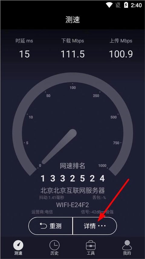 2、测速后可以查看网络时延、/上传Mbps、网速排名、信号等,点击详情。