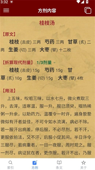 4、深入方剂详情页,不仅可查看古方原文,还能获取现代剂量换算、功效解析及适用症状,助力理解与应用。