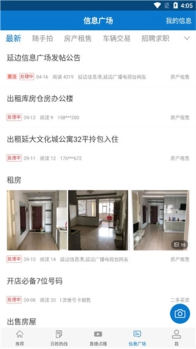 6、在信息广场页面,房屋租售、车辆交易、招聘求职等信息可随时了解;