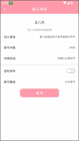 可以随时在线更新和发布个人创作的小说书籍内容,能够一键展示出自己的专属作品;