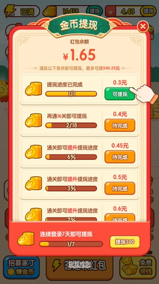 3、金币满足一定金额后点击提现,新人满0、3元绑定微信后即可提现;