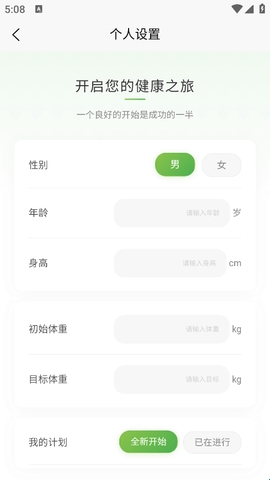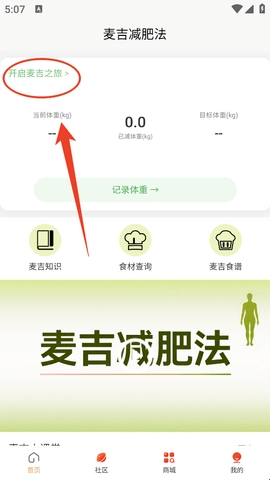 1、进入软件后,你的麦吉减肥之旅就可以正式开启啦,记得完善个人信息并记录体重哦。