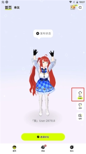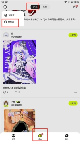 1、打开软件后点击“探索”,接着点击左上角的“+”按钮,然后选择“发状态”选项。