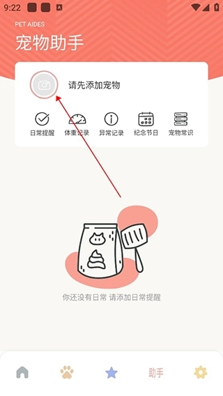 1、用户点击下发的铃铛图标就能进入助手页面,在这里可以添加宠物,记录宠物的体重、异常状况等信息,也能查看宠物相关的常识。
