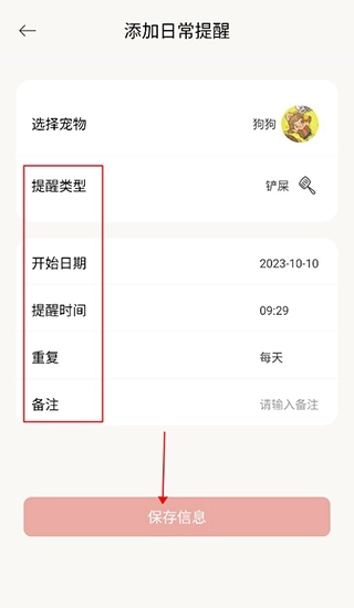 4、进入添加提醒的界面后,用户能够选择提醒类型,接着设置开始日期、提醒时间和重复次数,完成设置后点击保存就行。除了日常提醒外,用户还可以记录宠物体重、宠物的异常状况,以及宠物相关的纪念节日。