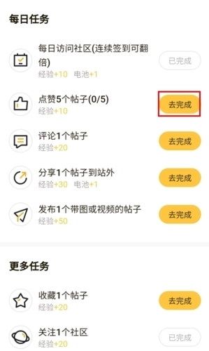2、任务中心页面包含每日任务与更多任务板块,用户点击对应的“去完成”按钮即可参与任务。