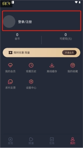 2、进入应用后,我们需要先进入【我的】页面,点击登录/注册按钮,这样才能观看影片。