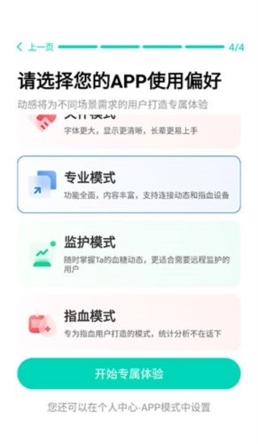 3、选择硅基动感使用偏好,目前已有关怀模式:适合长辈,专业模式:功能全面,监护模式:远程监护,指血模式:指血用户使用。